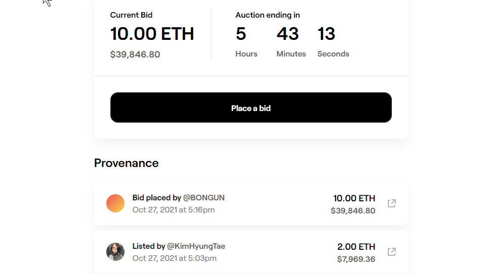 28일 관련업계에 따르면 김형태 시프트업 대표는 NFT 마켓 파운데이션에 작품 1점을 출품했다. 지난 27일 시작가는 2 ETH이지만, 현재 10 ETH까지 가격이 올랐다. 오늘 오후 5시 경에 경매가 종료된다는 가정 하에 최소 10 이더리움의 가치를 평가받는 셈이다.