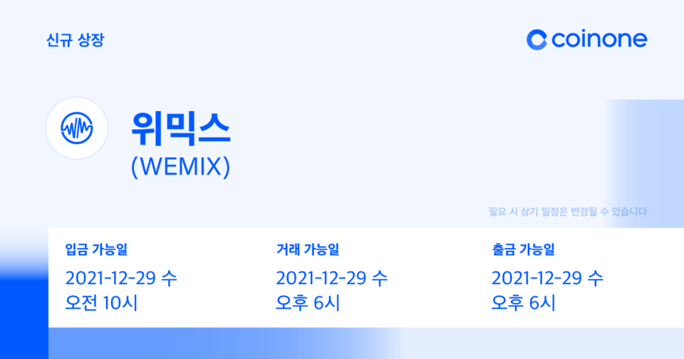 위믹스가 작년 12월 8일 코인원에서 거래지원 종료된 후 2023년 2월 16일 코인원 원화마켓 (재)상장이 공지되었습니다.