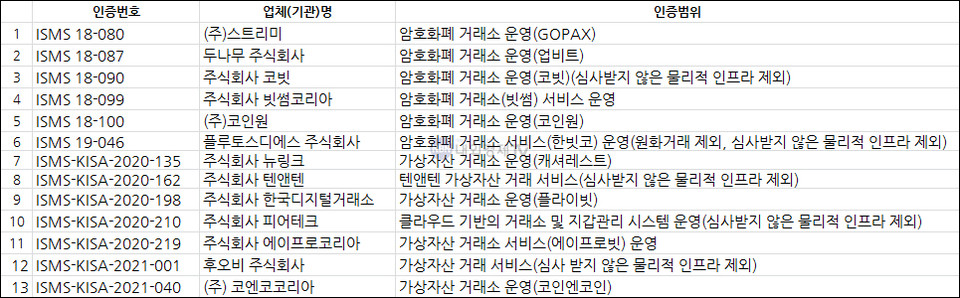 이로써 특금법 시행까지 열흘을 남겨둔 시점에서 ISMS 인증번호를 획득한 거래소는 총 13곳으로 늘었다. 이미 실명계좌가 발급된 거래소 4곳을 제외하고, 9곳은 실명 계좌와 원화 마켓 중에서 양자택일의 시점이 다가오고 있다.