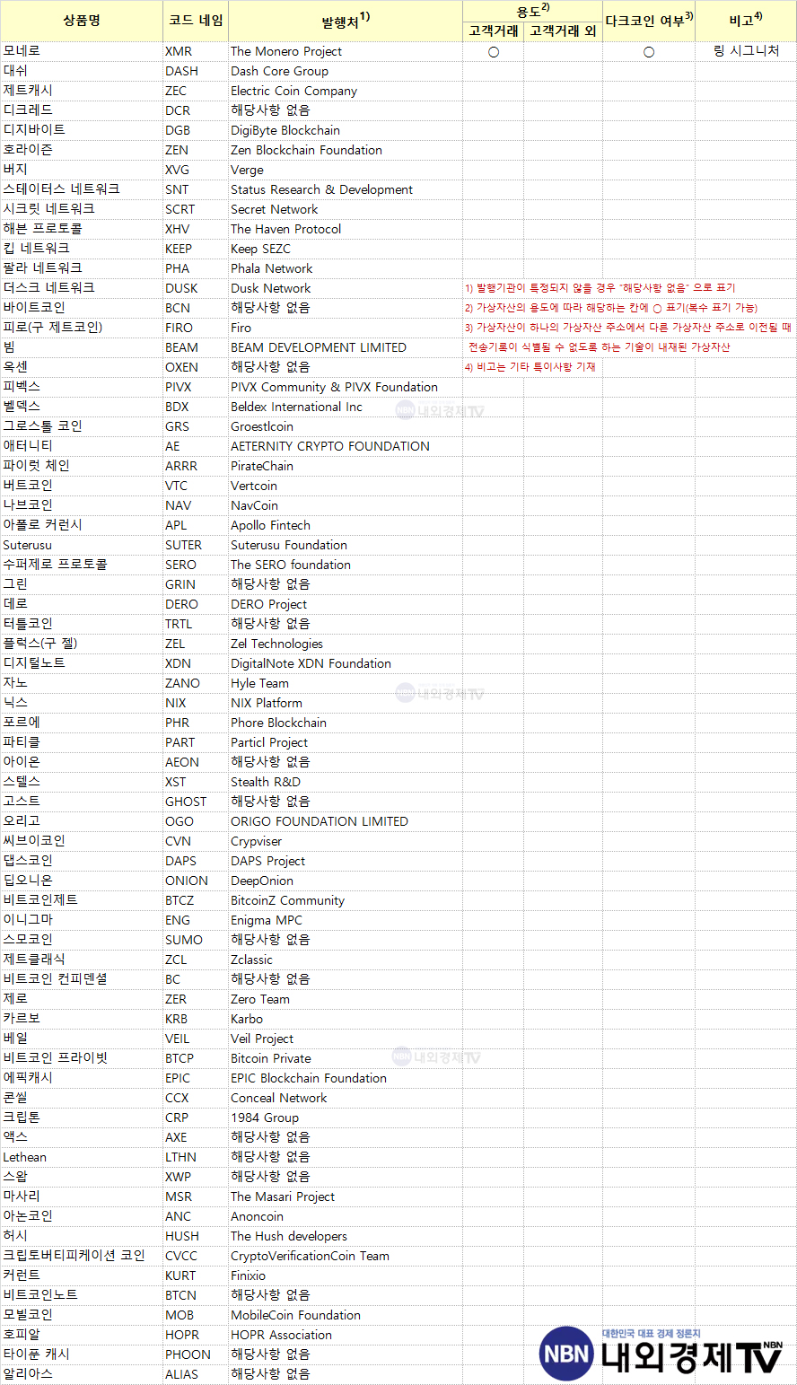 다만 프로젝트팀의 기술보다 N번방 사태로 촉발된 범죄 행위에 사용돼 '다크코인'으로 분류되는 것과 구분하기 위해 기사는 '프라이버시 코인'으로 표기한다. 프로젝트팀, 재단 등이 사생활 보호 목적과 익명성을 강조한 이상 프라이버시 코인 리스트를 작성했다.