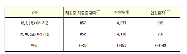 위중증 환자는 전날보다 5명 감소한 852명으로 3일 연속 800명 대를 기록하고 있으며, 사망자는 53명 늘어 누적 사망자는 4,130명으로 확인됐다.