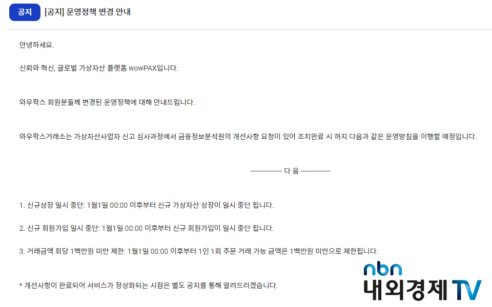 와우팍스 관계자는 "신고 심사과정에서 금융정보분석원의 개선사항 요청이 있어 1월 1일부터 신규 상장과 회원가입이 일시 중단된다"고 말했다.