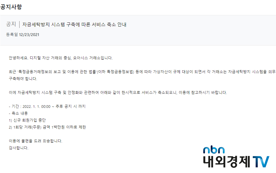 오아시스 관계자도 "자금세탁방지 시스템 구축 및 안정화와 관련해 신규 회원가입과 1회당 거래 제한 등이 시행된다"고 전했다.