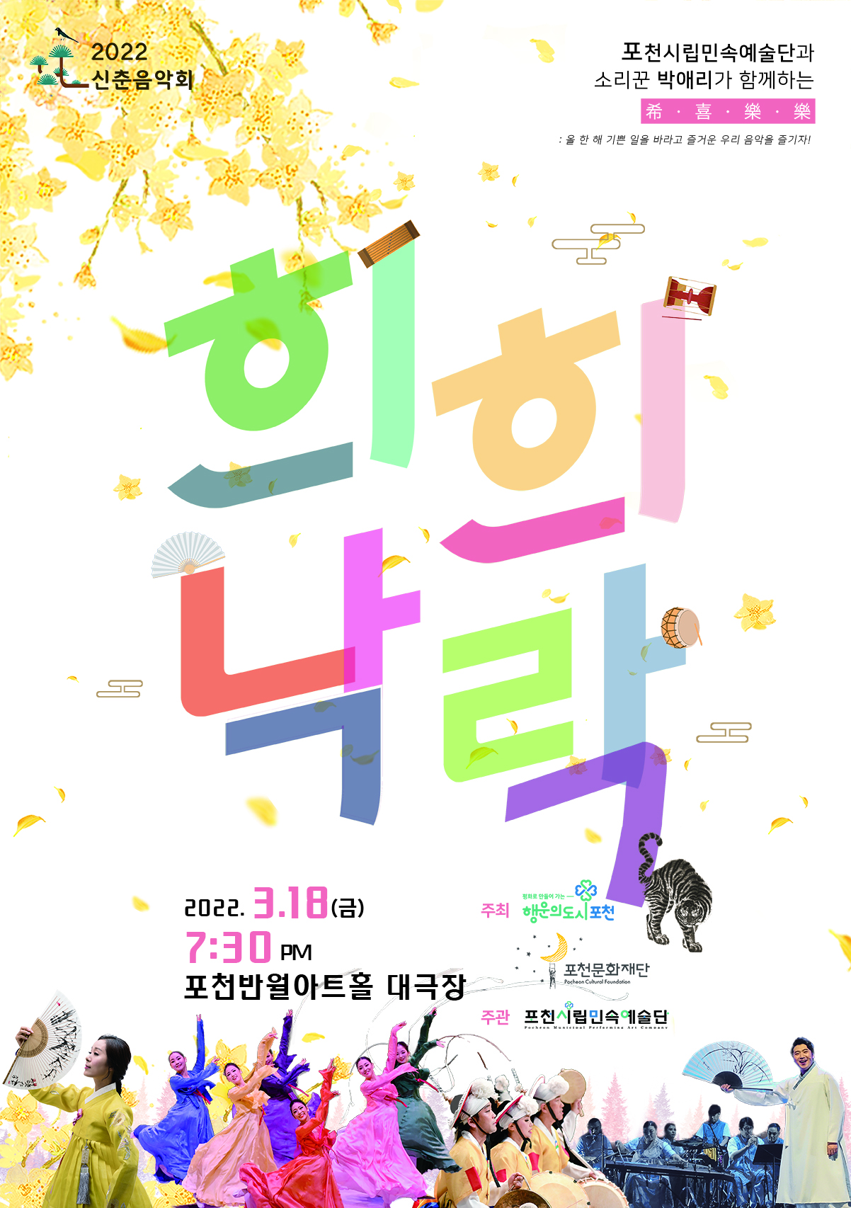 [수도권=내외경제TV] 양상현 기자= 경기 포천시립민속예술단(예술감독 이승주)은 오는 4월 8일 오후 7시 30분 포천반월아트홀 대극장에서 신춘음악회 ‘희희낙락(希喜樂樂)’ 공연을 마련한다고 전했다.