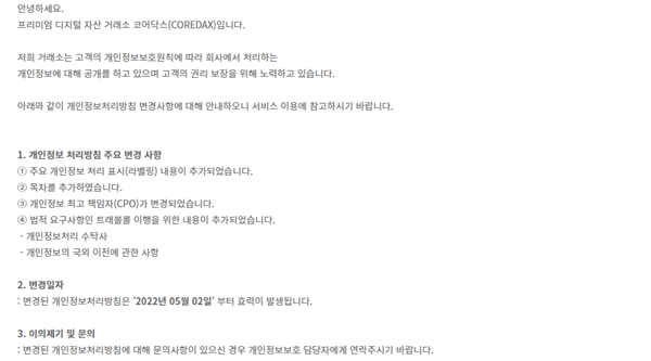 6일 관련 업계에 따르면 캐셔레스트, 델리오, 비둘기지갑, 포블게이트, 텐앤텐, 코어닥스 등은 개인정보 처리방침을 추가했지만, 빗크몬을 비롯한 비트레이드, KDAC, 오아시스, 프로비트, 코인엔코인 등은 과거의 개인정보 처리방침을 방치한 채 영업 중이다.