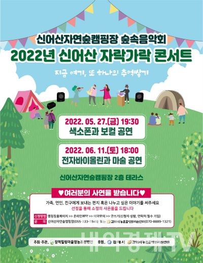 [경남=내외경제TV]이재훈 기자= 김해시는 신어산 자연숲캠핑장(장척힐링영농조합법인)이 오는 27일, 6월 11일 2회에 걸쳐 ‘2022년 신어산 자락가락 콘서트’를 연다고 밝혔다.