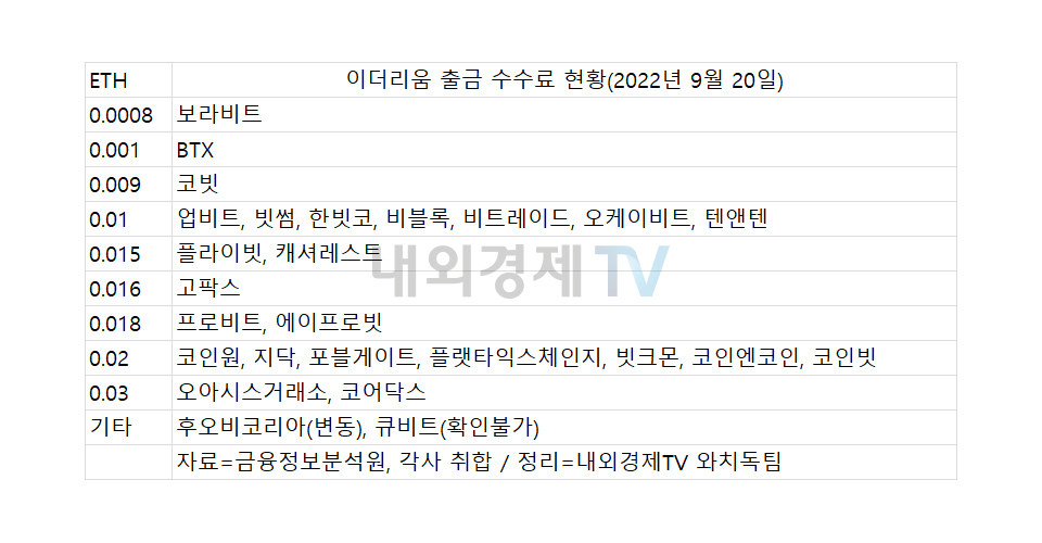 20일 내외경제TV 와치독팀이 확인한 이더리움 출금 수수료 현황에 따르면 최소 0.0008ETH에서 최대 0.03 ETH까지 편차가 큰 것으로 나타났다. 매수와 매도 체결 수수료가 퍼센트(%)로 책정되는 것에 비해 암호화폐 출금 수수료는 고정이다.