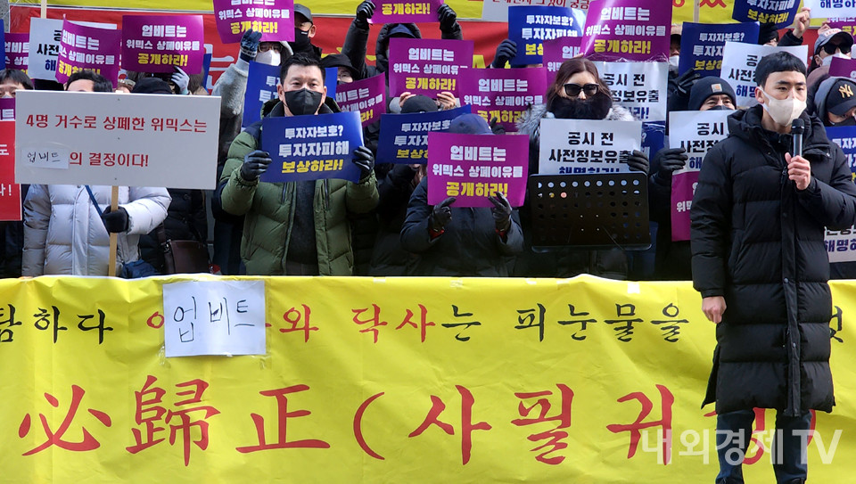 [내외경제TV] 정동진 기자=오늘(2일) 오후 서울 강남구 업비트 건물 앞에서 위믹스 투자자들이 상장 폐지 이유를 공개하라는 집회를 하고 있다. 관련기사 [전문] 위메이드 "위믹스(WEMIX) 신뢰 회복 위해 필사적으로 노력했다" [전문] DAXA "위믹스(WEMIX) 상장 폐지, 회원사 만장일치 결론" 정동진 기자 msn06s@nbntv.co.kr 다른기사 보기 저작권자 © 내외경제TV 무단전재 및 재배포, AI학습 및 활용 금지 개의 댓글 회원로그인 댓글 내용입력 댓글 정렬 최신순 추천순 답글순 BEST댓글 BEST 댓글 답글과 추천수를 합산하여 자동으로 노출됩니다. 닫기 더보기 댓글삭제 삭제한 댓글은 다시 복구할 수 없습니다. 그래도 삭제하시겠습니까? 비밀번호 댓글수정 댓글 수정은 작성 후 1분내에만 가능합니다. 본문 / 400 비밀번호 내 댓글 모음 닫기